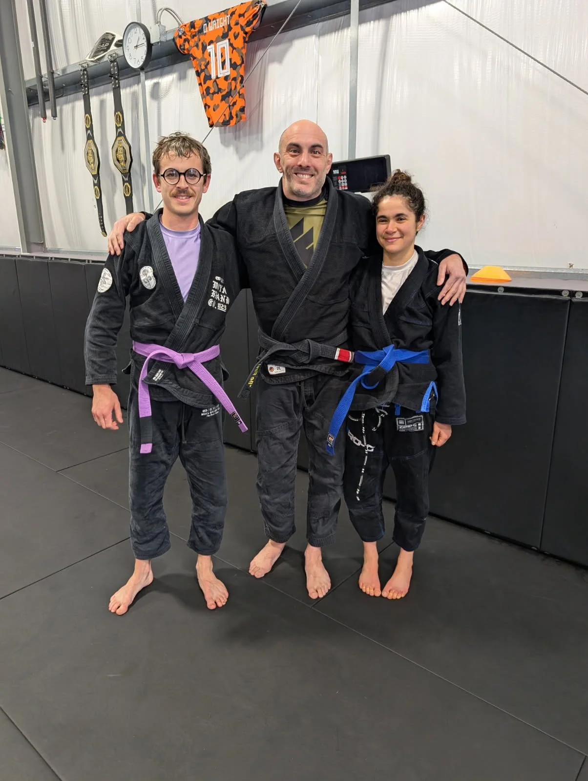 This is a photo of Noah & I with our jiu jitsu coach, Kyle.